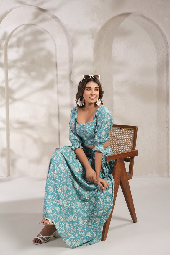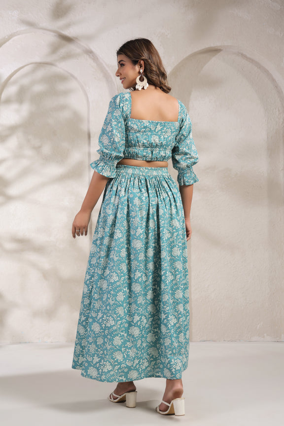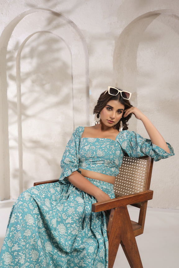 A breezy and elegant crop top and skirt set crafted from pure cotton, featuring traditional hand-block prints and a flattering silhouette perfect for everyday wear or casual outings.