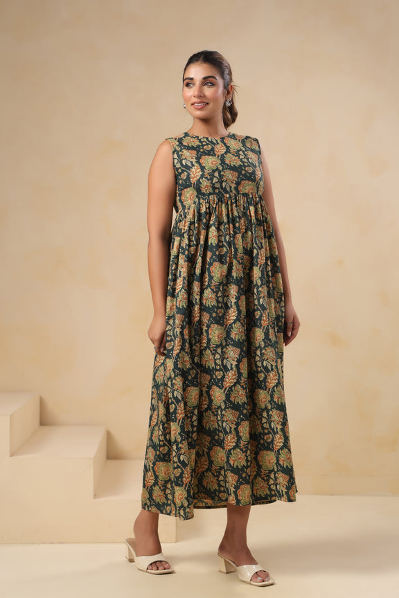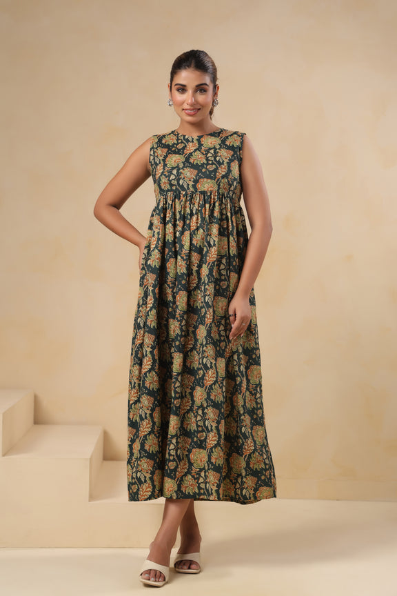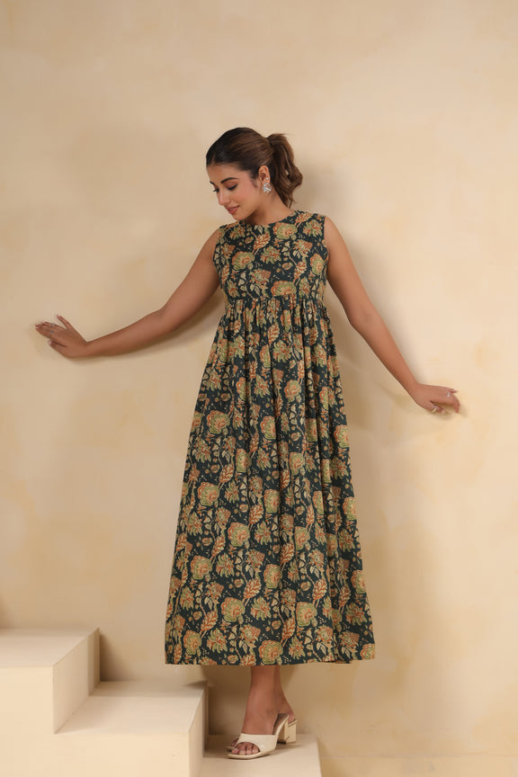 A breezy and elegant emerald green jal print dress crafted from pure cotton, featuring traditional hand-block prints and a flattering silhouette perfect for everyday wear or casual outings.