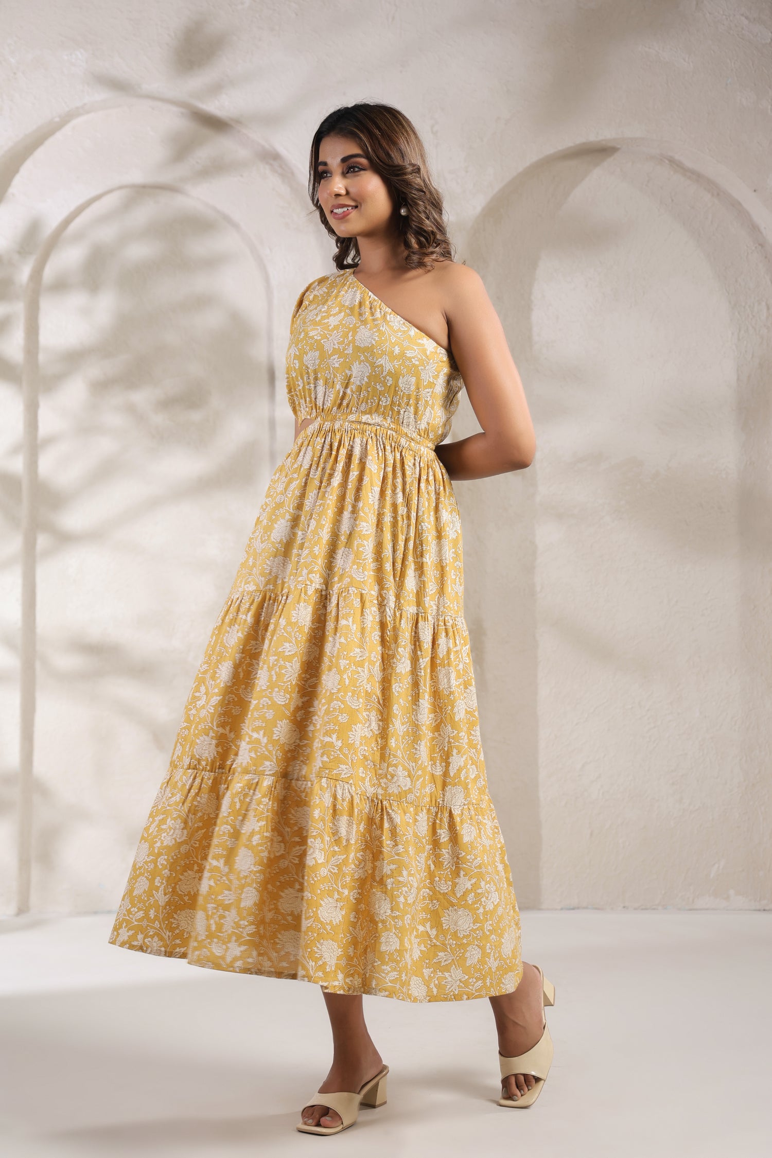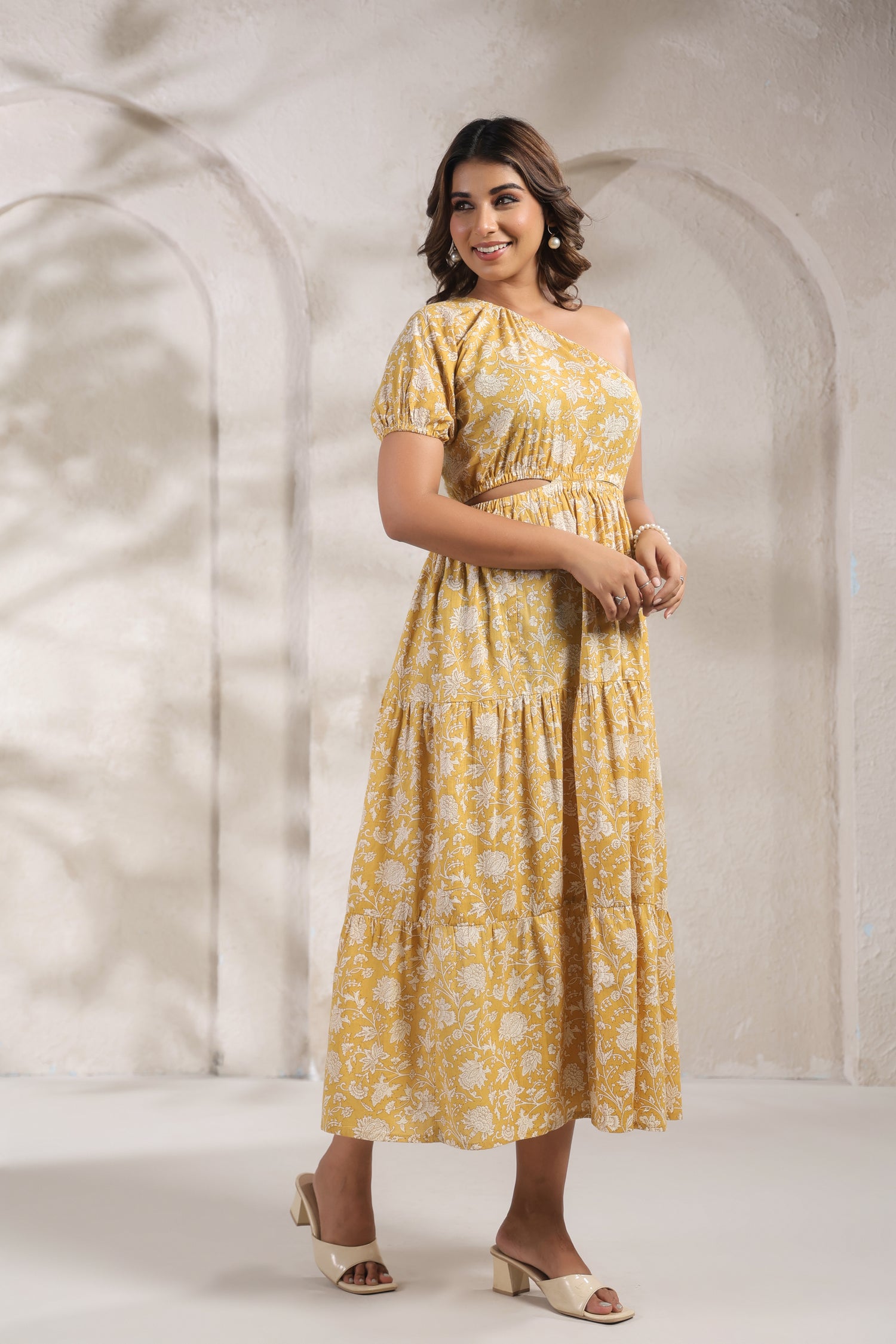 A breezy and elegant yellow dress crafted from pure cotton, featuring traditional hand-block prints and a flattering silhouette perfect for everyday wear or casual outings.