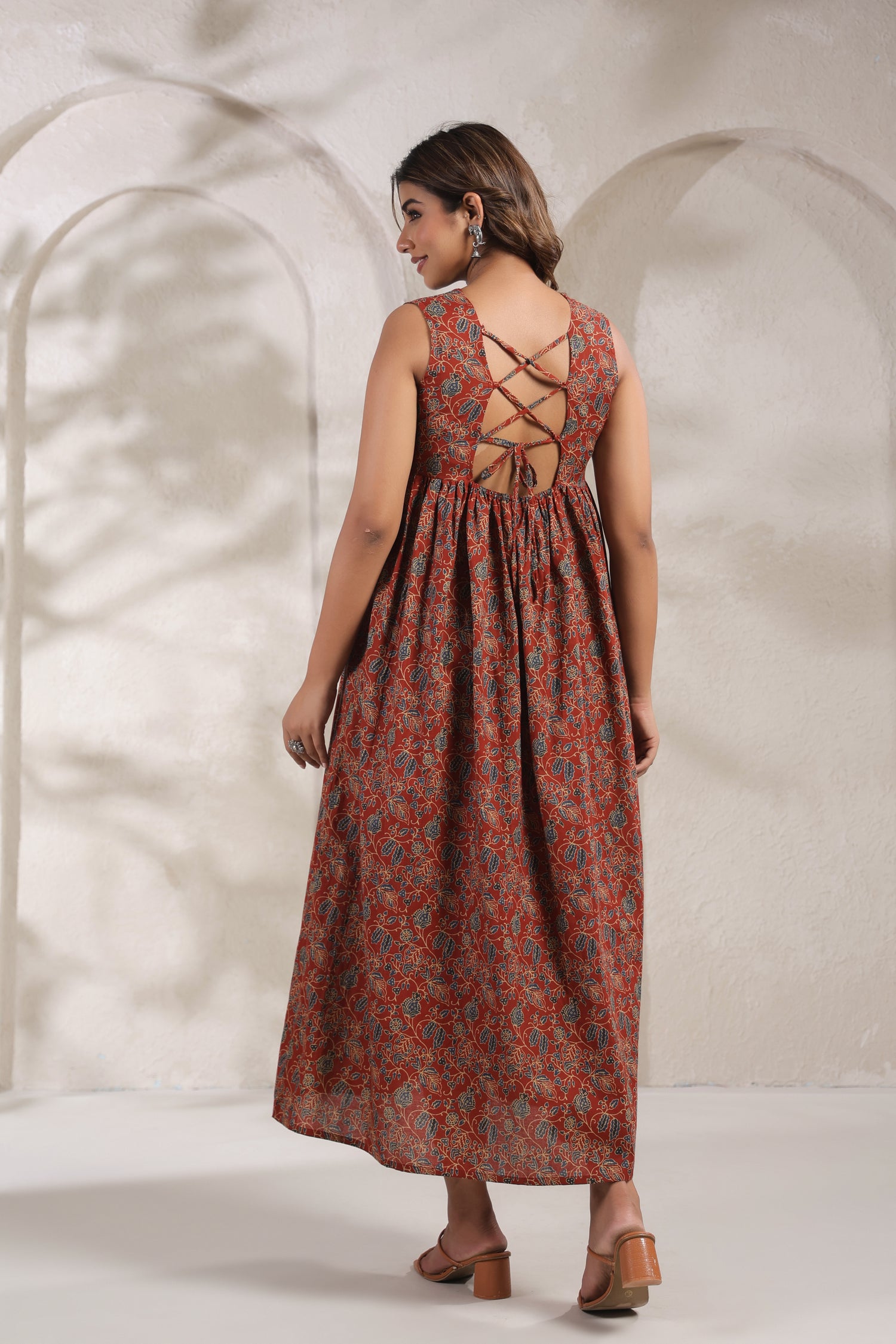 A breezy and elegant red jal dress crafted from pure cotton, featuring traditional hand-block prints and a flattering silhouette perfect for everyday wear or casual outings.
